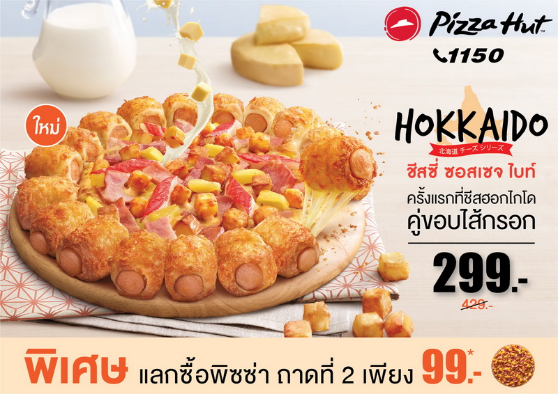 ”พิซซ่าฮอกไกโด ชีสซี่ ซอสเซจ ไบท์” เป็นพิซซ่าขอบไส้กรอกชีส ซึ่งเพิ่มเติมความอร่อยที่ขอบด้วยเชดด้าชีสหอมกรอบ บิดอร่อยพอดีคำ มาพร้อมกับฮอกไกโดชีส สุดพรีเมียม นุ่มหนึบสไตล์ญี่ปุ่น ซึ่งมีให้เลือกสองรสชาติได้แก่ เบคอนไบท์ ในราคา 299 บาท และซีฟู้ดไบท์ ในราคา 359 บาท คุ้มสุดๆเช่นเคยกับสิทธิแลกซื้อ พิซซ่าหนานุ่ม หรือบางกรอบถาดต่อไปเพียง 99 บาท และพิเศษสำหรับคนชอบทานเมนูหลากหลาย สามารถเลือกซื้อ “ฮอกไกโดเบคอน ทริปเปิ้ลว๊าวบ๊อกซ์” กล่องเกมสามชั้น เอาใจคุณหนูๆและทุกคนในครอบครัว ที่มีทั้งพิซซ่าสองถาด ฮอกไกโดแมคแอนด์ชีส ไก่นิวออร์ลีนส์วิงส์ ชีสซี่ป๊อป และการ์ลิคไบท์ได้ในราคาเพียง 599 บาท ได้อีกด้วย ทั้งหมดนี้สั่งได้เลยที่ www.pizzahut.co.th หรือโทร 1150 และร้านพิซซ่าฮัททุกสาขา ตั้งแต่วันนี้ จนถึง 31 มีนาคม 2562