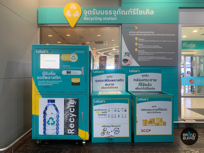 ดังเช่น กรณีของโลตัส ที่จัดหาพื้นที่รับบรรจุภัณฑ์รีไซเคิล พัฒนามาจากอินไซต์ที่ผู้บริโภคหลายคนอยากมีส่วนร่วมในการกำจัดขยะ แต่ขั้นตอนมากมาย หาที่ทิ้งขยะที่คัดแยกแล้วไม่ได้ ถึงแม้ว่าจะตั้งใจแยกขยะ แต่ปลายทางขยะก็ถูกนำไปรวมกันแล้วปนเปื้อนอยู่ดี ความร่วมมือระหว่างแบรนด์จึงเกิดขึ้น เมื่อฝั่งโลตัสมีพื้นที่และเป็นจุดหมายปลายทางที่คุณแม่บ้านต้องมาจับจ่ายอยู่แล้ว ขณะเดียวกันทาง SCGP ผู้พัฒนาบรรจุภัณฑ์ก็มีเทคโนโลยีที่จะนำแพ็กเก็จจิ้งกล่องและลังกระดาษที่ใช้แล้วใช้แล้วไปจัดการได้อย่างเหมาะสม ก่อนนำกลับไปรีไซเคิลเป็นกล่องกระดาษใหม่ที่แข็งแรงและสมบูรณ์อีกครั้ง ทั้งสองจึงร่วมมือกัน ตามแนวทางเศรษฐกิจหมุนเวียน (Circular Economy) ใช้ทรัพยากรให้คุ้มค่าที่สุด