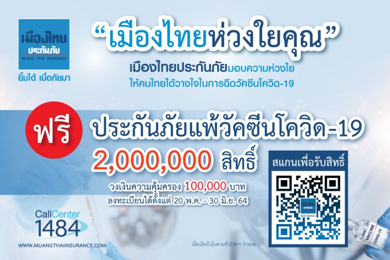 เมืองไทยประกันภัย เคียงข้างสังคมไทยร่วมมอบความห่วงใยให้คนไทย ผ่านโครงการ “เมืองไทยห่วงใยคุณ” แจกฟรีประกันภัยแพ้วัคซีนโควิด-19 2,000,000 สิทธิ์ มอบวงเงินความคุ้มครอง 100,000 บาท กรณีภาวะโคม่าที่ได้รับผลกระทบจากการฉีดวัคซีนป้องกันโรคติดเชื้อไวรัสโคโรนา 2019 เริ่มเปิดลงทะเบียนตั้งแต่ 20 พ.ค. ถึง 30 มิ.ย. 2564