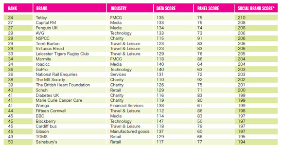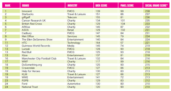 ส่วนใน Top 10 มีแบรนด์จากหลายกลุ่มธุรกิจ เช่น GiffGaff (มือถือ) อันดับ 4 และตามด้วย 3 มูลนิธิ Cancer Research UK, British Red Cross, ARKive ด้านอันดับ 7 เป็นของ ASOS และ Cadbury และปิดท้ายอันดับ 9 Met Office และ The Ellen De Generes Show ในขณะฝาก Dell เบอร์ 1 ปีที่แล้วกลับร่วงหล่นลงมาที่อันดับ 59