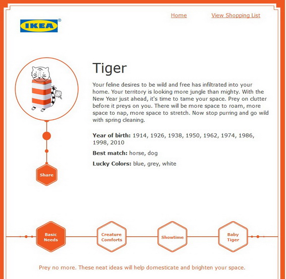 แคมเปญนี้ใช้แอพพลิเคชั่นในเฟซบุ๊คร่วมสนุกกับผู้เล่น โดยใส่วัน-เดือน-ปีเกิด แล้วแอพฯ ก็จะแรนดอมเฟอร์นิเจอร์ที่เหมาะสมตามปีเกิดออกมา รวมทั้งแนะนำสีที่เป็นมงคล แน่นอนว่าหลังจากนั้นก็จะนำเสนอสินค้าต่างๆ ของอิเกีย เช่น ตู้ เตียง โต๊ะ เป็น หลังจากนั้นก็คลิกเข้าไปเพื่อสั่งซื้อสินค้าต่อได้เลย ถือว่าเป็นแอพฯ ที่ทำให้เกิดการช็อปปิ้งได้ง่ายขึ้น และเข้ากับความเชื่อของคนเอเชียได้เป็นอย่างดี