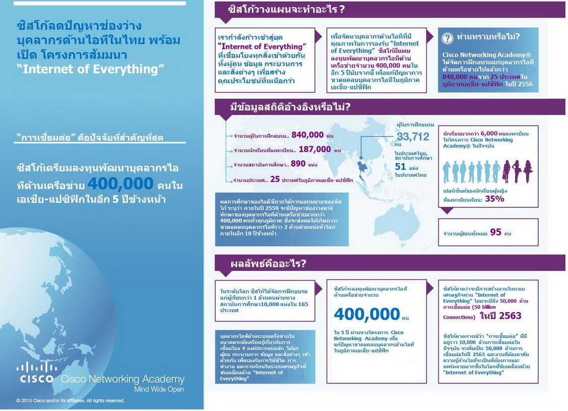 ด้วยความเชี่ยวชาญที่เหนือชั้นในการพัฒนาเทคโนโลยีเครือข่าย ซิสโก้จึงมีความพร้อมในการให้ความช่วยเหลือแก่ลูกค้าเพื่อใช้ประโยชน์อย่างเต็มศักยภาพจากเครือข่ายอินเทอร์เน็ตที่เชื่อมโยงทุกสิ่ง ภายใต้ Cisco Networking Academy ซิสโก้จะช่วยจัดการฝึกอบรมบุคลากรและแก้ไขปัญหาช่องว่างทักษะด้านไอทีภูมิภาคเอเชีย-แปซิฟิก และเตรียมความพร้อมให้แก่บัณฑิตสำหรับการก้าวเข้าสู่โลกยุคใหม่ที่ซึ่งสิ่งต่างๆในโลกเกือบทั้งหมดถูกเชื่อมต่อเข้าด้วยกัน