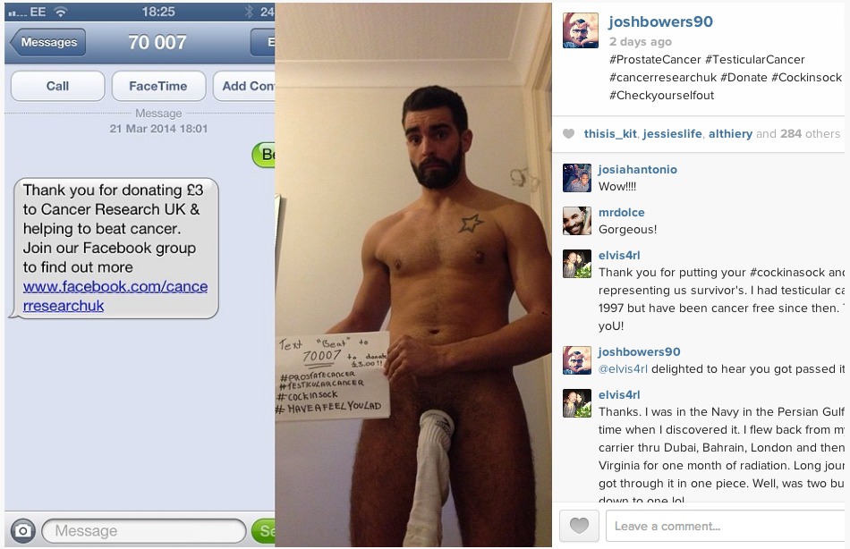Cancer Research UK สถาบันวิจัยโรคมะเร็งแห่งประเทศอังกฤษ ได้ออกแคมเปญ Cock in a Sock เพื่อรวบรวมเงินบริจาค สำหรับไปใช้ในงานวิจัยต้านมะเร็งอัณฑะ ด้วยการจุดกระแสให้ชายหนุ่มทั้งหลาย ที่มั่นใจในสรีระหรือเพียงใจบุญสุนทาน ร่วมกันแก้ผ้า ให้เหลือไว้แต่ถุงเท้าครอบน้องชาย แล้วจึงถ่ายและอัพรูปตัวเองลงโซเชียลเน็ตเวิร์ค