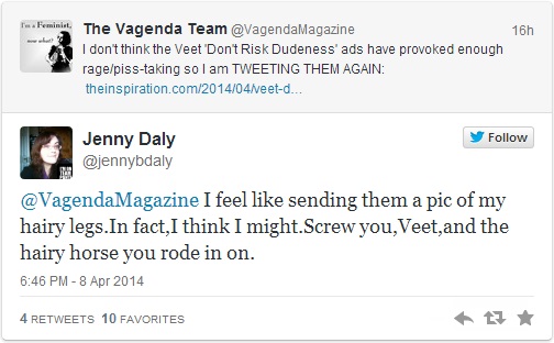 โฆษณาชุดนี้มีชื่อว่า “Don’t Risk Dudeness” ซึ่งมีทั้งหมด 3 เวอร์ชั่น โดยหลังจากที่ Veet ได้ปล่อยโฆษณาชุดดังกล่าวออกไป ก็เกิดกระแสวิพากษ์วิจารณ์ใน Twitter ค่อนข้างมาก เพราะแม้ว่าผู้หญิงส่วนใหญ่มักจะมีความสุขกับการได้แว็กซ์หรือกำจัดขน ตามจุดต่างๆของร่างกาย เพราะมันจะทำให้พวกเธอดูดีขึ้นทันตาเห็น อย่างไรก็ตาม พวกเธอก็มิใคร่พึงพอใจนัก หากมีใครมาบอกกับเธอว่า “ถ้าเธอไม่แว็กซ์ เธอจะเหมือนผู้ชาย”