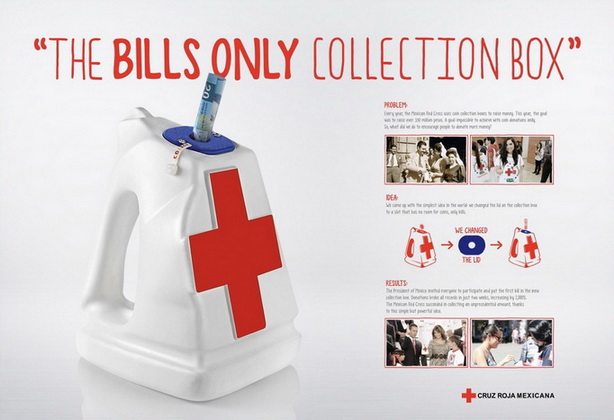 กาชาดของประเทศเม็กซิโก (Mexican Red Cross) ปกติออกเรี่ยไรให้หย่อนเงินทำบุญลงกระป๋องปกติ แต่ปีนี้ต้องการเพิ่มจำนวนเรี่ยไร่เงินเพิ่มขึ้นเป็น 330 ล้านเปโซ แล้วจะทำอย่างไรให้คนมาบริจาคเพิ่มมากขึ้น Mexican Red Cross ร่วมกับ JWT MEXICO Mexico City เปลี่ยนกระป๋องเรี่ยไรที่ปากค่อนข้างใหญ่(ใส่เหรียญ) ให้กลายเป็นรูเล็กลง ทั้งนี้ตั้งใจให้ผู้บริจาคม้วนธนบัตรเป็นแท่งๆ แล้วหย่อนบริจาคเท่านั้น (The Bills Only Collection Box) ซึ่งทำให้เงินบริจาคเพิ่มมากขึ้น เพียงสองสัปดาห์ก็ได้เงินบริจาคตามเป้า