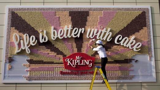 Mr. Kipling ร้านขนมหวานจากอังกฤษปล่อยไอเดียสุดเจ๋งเนรมิตเค้กกว่าหมื่นชิ้นลงบนโฆษณาบิลบอร์ด โดยมีเอเจนซี่ JWT London เป็นผู้ช่วยสร้างสรรค์ การออกแบบบิลบอร์ดเค้กครั้งนี้ มีศิลปินมืออาชีพอย่าง Michelle Wibowo ผู้โด่งดังจากการออกแบบรูป Portrait ของเจ้าชายวิลเลี่ยมและจอร์ชด้วย ช๊อคโกแลต Toblerone กว่า 16,074 ชิ้น มาเป็นผู้ช่วย