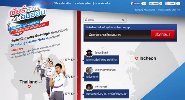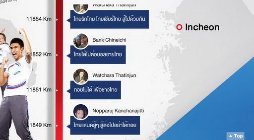 ความน่าสนใจของแคมเปญ “เชียร์ให้้ไกล ส่งไปอินชอน” ช่วงเวลาถ่ายทอดสดมีชาวไทยเข้ามาร่วมเชียร์ 1 วินาที ต่อ 1 โพส ซึ่งทำให้ทะลุเป้าหมายระยะทาง 4,400 กิโลเมตร (ระยะทางกรุงเทพ-อินชอน)ไปอย่างรวดเร็ว ปัจจุบันได้ระยะทางมากกว่า 11,000 กว่ากิโลเมตรไปเรียบร้อยแล้ว
