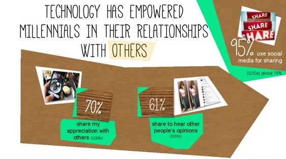 กลุ่ม Millennial สามารถ Blend ทุกสิ่งรอบตัวเข้ามาเป็นส่วนหนึ่งของชีวิตได้อย่างรวดเร็วโดยเฉพาะเรื่องเทคโนโลยี อีกทั้งเมื่อมีมือถือสมาร์ทโฟนเป็นส่วนตัวและติดตัวไปตลอดเวลา พวกเขาก็พร้อมที่จะ Connect และ Share ได้ตลอดเวลา หรือ Always ON จากวิจัยพบว่า Millennial มี Devices อยู่ในมือเยอะ (กลุ่มไทยมีสมาร์ทโฟนเป็นของตัวเอง 81% ซึ่งมากกว่า Global ถึง 2 เท่า และเป็นเจ้าของ Devices มากกว่า 3 เครื่องถึง 50%)