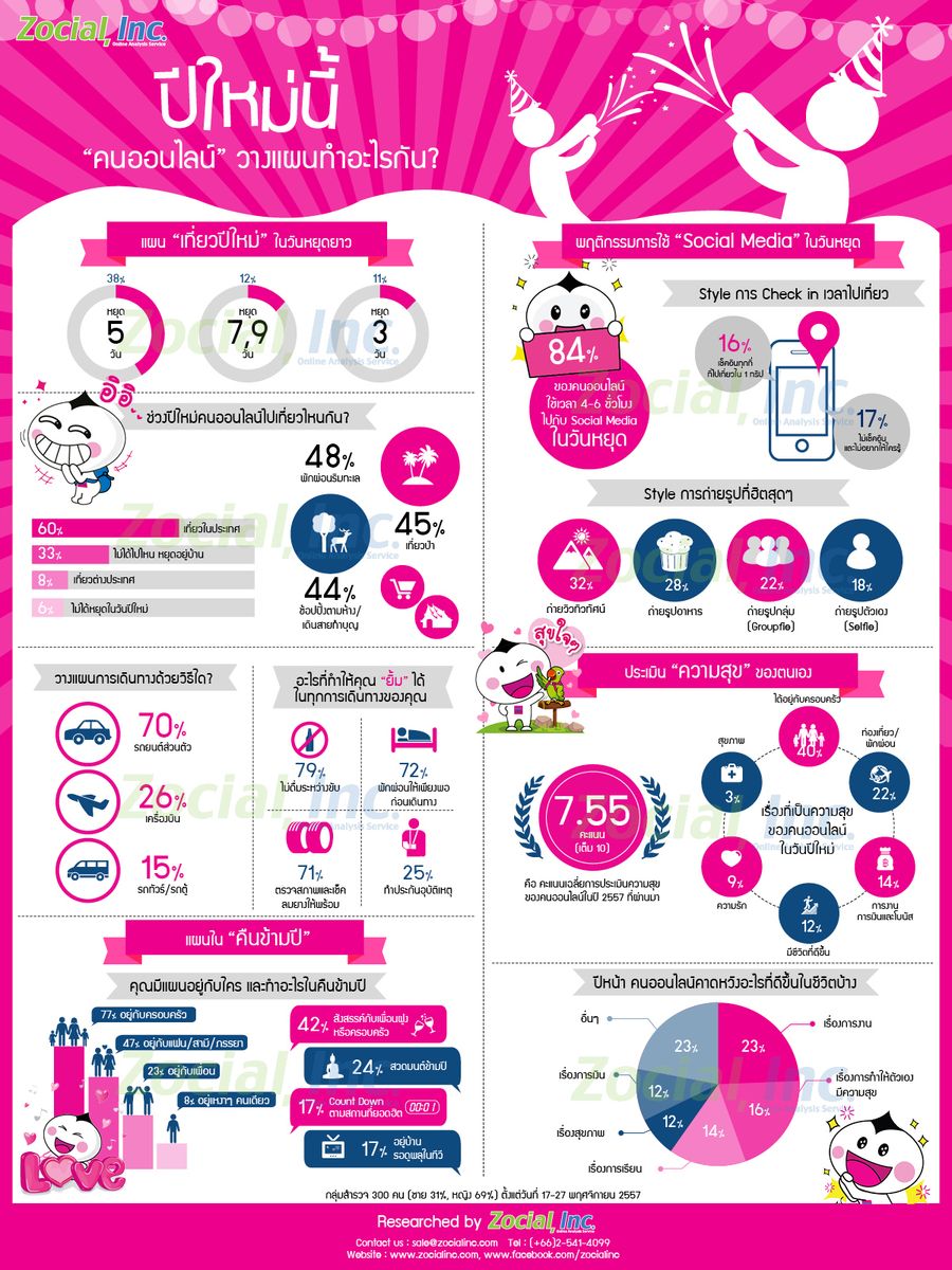 ใกล้ปีใหม่แล้ว ได้เวลาวันหยุดยาวววววว หลายๆคนมีแผนจะทำโน่นทำนี่เต็มไปหมด ไม่ว่าจะเป็นไปเที่ยวต่างจังหวัด,เที่ยวต่างประเทศหรือตั้งใจทำอะไรสักอย่างเพื่อเปลี่ยนแปลงตัวเอง แต่หากใครยังไม่มีแผนว่าปีใหม่นี้จะไปไหนดี Infographic ตัวนี้มีคำตอบ!! Zocial, inc. ทำการสำรวจคนออนไลน์กว่า 300 ตัวอย่าง แบ่งเป็น เพศชาย 31% และเพศหญิงอีก 69% เมื่อวันที่ 17 – 27 พฤศจิกายน 2557 เกี่ยวกับแผนปีใหม่ของพวกเขา มีอะไรน่าสนใจบ้าง