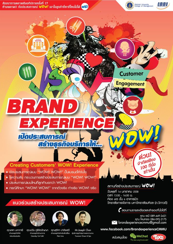 Brand Experience เปิดประสบการณ์สร้างธุรกิจบริการให้… WOW!!! สัมมนาการตลาดเชิงอภิปราย ซึ่งจัดโดยนักศึกษาระดับปริญญาโท วิทยาลัยการจัดการ มหาวิทยาลัยมหิดล (CMMU) ซึ่งจัดต่อเนื่องมาจนปัจจุบันเป็นครั้งที่ 17 แล้ว โดยมีวัตถุประสงค์ให้นักศึกษาได้พัฒนาและยกระดับความรู้ความสามารถในการวิเคราะห์กรณีศึกษาทางการตลาดในเชิงลึก เพื่อสามารถนำเสนอผลงานในรูปแบบของงานสัมมนาทางการตลาดที่สามารถให้ผู้ที่เข้าร่วมสัมมนาสามารถนำข้อมูลไปประยุกต์ในการพัฒนาธุรกิจ