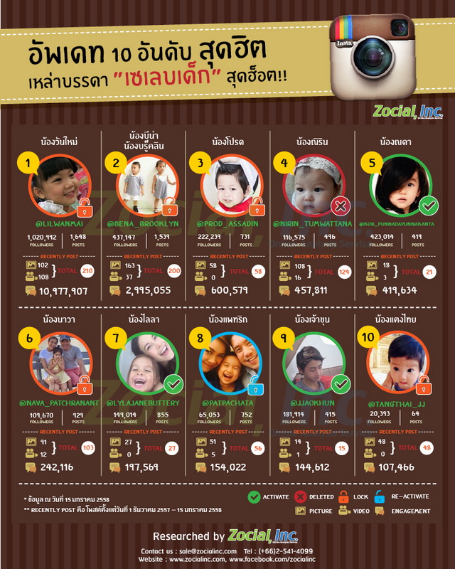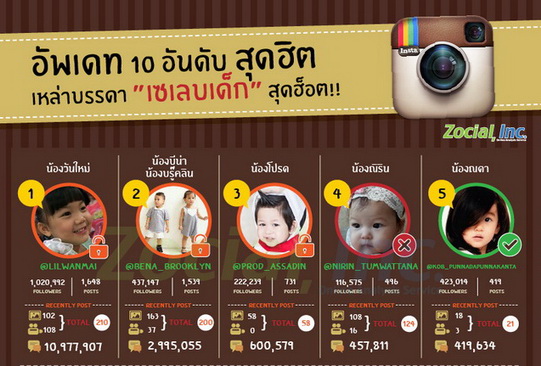 เป็นเรื่องเป็นราวขึ้นมา เมื่อทาง Instagram เริ่มจริงจังกับ Policy มากขึ้น ตั้งแต่การลบ Fake User ออกไปเมื่อไม่นานมานี้จนก่อให้ยอด Followers หายกันไปเป็นแถบๆ และปัจจุบันที่กำลังเป็นประเด็นร้อนก็คือ การลบ User ที่มีอายุต่ำกว่า 13 ปี Zocial inc. ได้นำเสนอ 10 อันดับ IG ของเหล่าเซเลปตัวน้อยที่มีค่าปฏิสัมพันธ์ (Social Engagement) สูงที่สุด และความเคลื่อนไหวของเหล่าบรรดา พ่อ-แม่ จะเป็นใครบ้าง ตามไปดูเลย!!