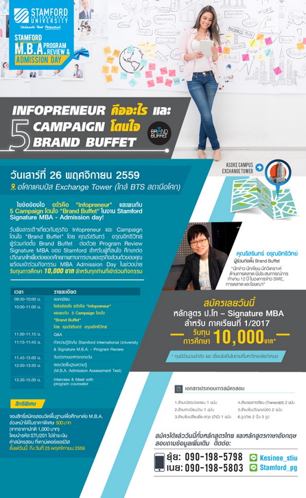 | 11.15 – 11.45 น. | ทำความรู้จักกับ Stamford International University & Signature M.B.A. – Program Review |