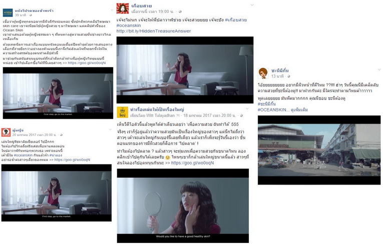 ด้วยการนำเสนอแบบ “ตลกขบขัน” ที่ยังไม่ค่อยมีสกินแคร์แบรนด์ไหนทำโฆษณาแนวนี้ ทำให้คนดูรู้สึกแปลกใหม่ และอยากติดตาม ขณะเดียวกันสามารถบอกเล่าคุณสมบัติที่เป็น “จุดเด่น” ของสินค้าได้อย่างลงตัว ทำให้หลังจากปล่อยวีดีโอโฆษณา “OCEAN SKIN” บนสื่อสังคมออนไลน์ เพียงไม่นานกลายเป็นกระแสมาแรง โดยถูกพูดถึงมากมาย ทั้งจากบรรดา Facebook Fan Page ชื่อดังต่างๆ และคนในสื่อสังคมออนไลน์ต่างกด “ถูกใจ” และ “แชร์” วีดีโอนี้ต่อ