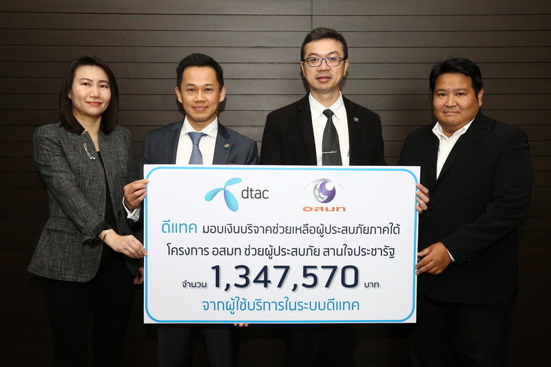 คุณภารไดย ธีระธาดา รองประธานเจ้าหน้าที่บริหาร กลุ่มกิจการองค์กร (สองจากซ้าย) และ คุณอรอุมา ฤกษ์พัฒนาพิพัฒน์ ผู้อำนวยการอาวุโสฝ่ายสื่อสารองค์กรและการพัฒนาที่ยั่งยืน (ซ้าย) บริษัท โทเทิ่ล แอ็คเซ็ส คอมมูนิเคชั่น จำกัด (มหาชน) หรือดีแทค เป็นตัวแทนบริษัทฯ มอบเงินบริจาคช่วยเหลือผู้ประสบภัยน้ำท่วมภาคใต้ ในโครงการ “อสมท ช่วยผู้ประสบภัย สานใจประชารัฐ” จำนวนเงิน 1,347,570 บาท (หนึ่งล้านสามแสนสี่หมื่นเจ็ดพันห้าร้อยเจ็ดสิบบาทถ้วน) โดยมี คุณพิเศษ จียาศักดิ์ รักษาการ กรรมการผู้อำนวยการใหญ่ อสมท (สองจากขวา) และ คุณฤทธิไกร ทองมาลา ผู้อำนวยการฝ่ายธุรกิจไนท์เอนเตอร์ (ขวา) บริษัท อสมท จำกัด (มหาชน) เป็นตัวแทนรับมอบ