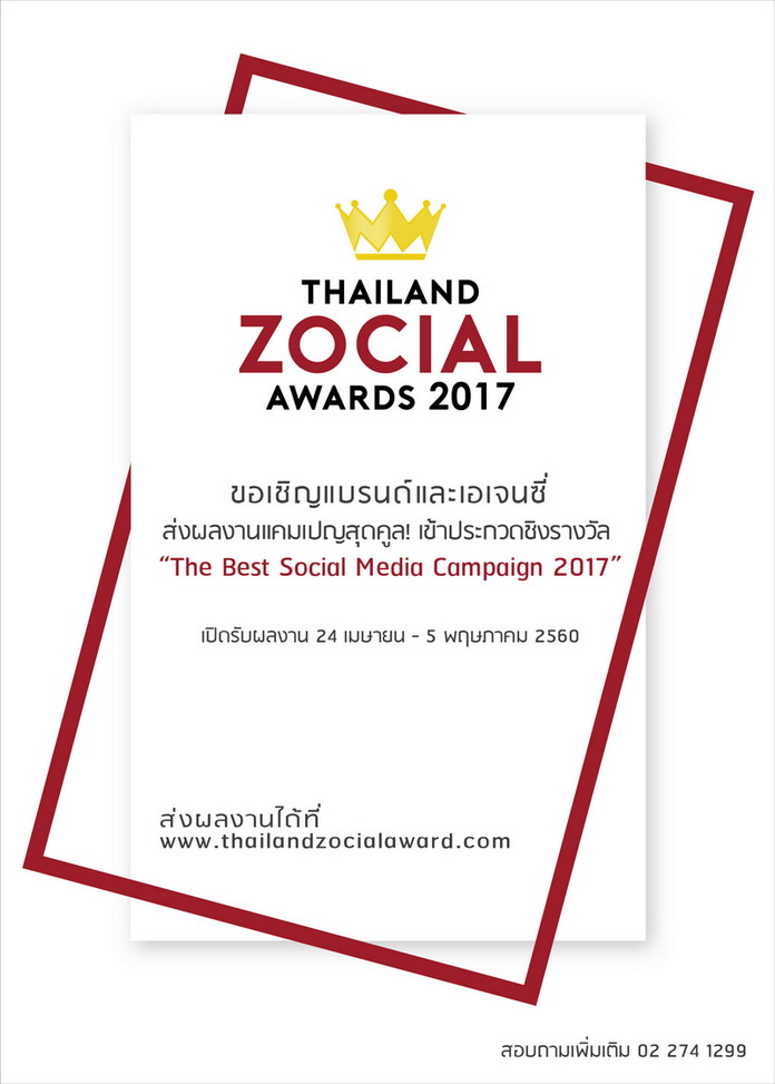 ทั้งนี้ สามารถดูรายละเอียดเพิ่มเติม และส่งผลงานเข้าประกวดได้ ตั้งแต่ 24 เมษายน – 5 พฤษภาคม 2560 ทาง www.thailandzocialawards.com ติดต่อสอบถามได้ที่ 06 3941 9555, 06 2454 9787