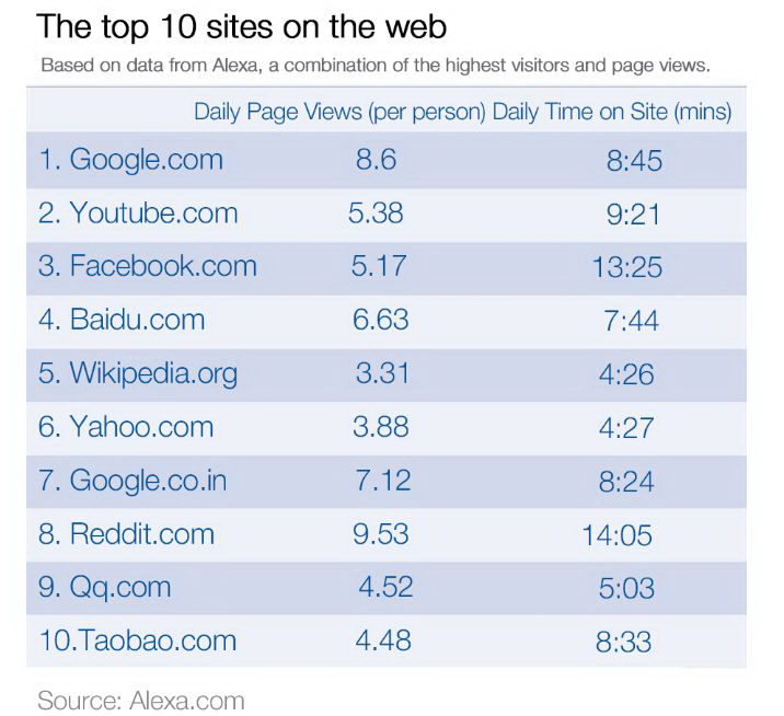 Alexza.com รวบรวมเว็บไซต์ที่คนเข้าชมมากที่สุดในโลก จากผู้ใช้อินเทอร์เน็ตทั่วโลกหลายล้านคน มาดูกันว่า 10 เว็บไซต์สุดฮิตที่คนนิยมเข้าชมมากที่สุดในโลกมีอะไรกันบ้าง