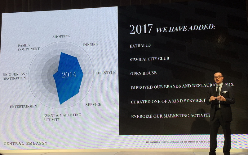 คุณบรม พิจารณ์จิตร กรรมการผู้จัดการ ศูนย์การค้าเซ็นทรัล เอ็มบาสซี ฉายภาพพัฒนาการของโครงการว่า ปีที่ผ่านมา Central Embassy มีลูกค้าเฉลี่ยวันละ 20,000 คน และในปีนี้ ด้วยแนวทางใหม่ กิจกรรมใหม่ เราจะและการทำให้เซ็นทรัล เอ็มบาสซี มี Dynamic มากขึ้น เพื่อตอบโจทย์คนได้หลากหลายกลุ่ม และเข้าถึงได้มากขึ้น ไม่ว่าจะเป็นการเปิดโอเพ่น เฮ้าส์ และศิวิไล ซิตี้ คลับ รวมถึงเพิ่มความหลากหลายของแบรนด์ในศูนย์ฯ ซึ่งปัจจุบันสัดส่วนร้านค้าแบรนด์ใหม่ อยู่ที่ 30% และขณะนี้ต้องการเพิ่มแบรนด์ที่คนส่วนใหญ่คุ้นเคย
