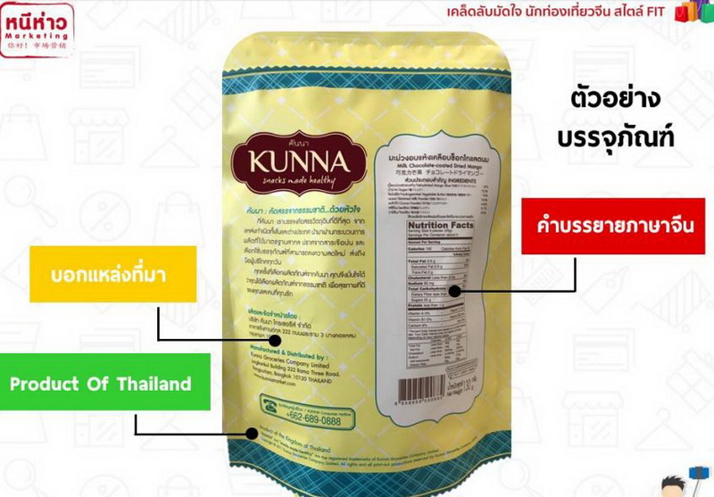 “บรรจุภัณฑ์” ที่จะเจาะตลาดคนจีน ต้องประกอบด้วย 1. อธิบายคุณภาพสมบัติของสินค้า และแหล่งที่มา 2. คำบรรยายภาษาจีน หรืออังกฤษ 3. ต้องมีคำว่า “Product of Thailand” เนื่องจากคนจีนมี Perception ที่ดีต่อสินค้าไทย 4. มีลวดลายเอกลักษณ์ไทย เพื่อบ่งบอกว่าเป็นแบรนด์ไทย และ 5. บรรจุภัณฑ์ต้องสามารถมองเห็นสินค้าภายในได้ชัดเจน เพราะคนจีนชอบที่จะเห็นของที่อยู่ข้างใน เพื่อให้มั่นใจก่อนตัดสินใจซื้อ