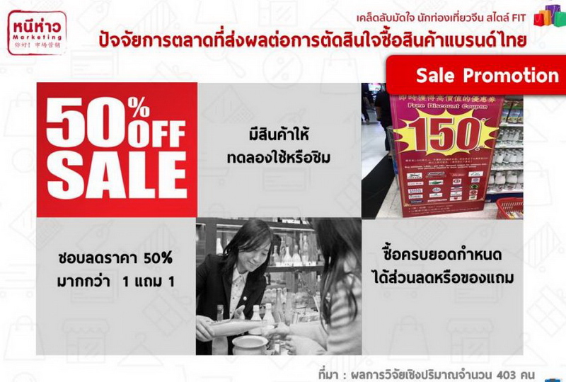 “Sale Promotion” ที่มีผลต่อการตัดสินใจซื้อของคนจีน คือ ลดราคา โดยเฉพาะลดราคา 50% ได้ผลดีที่สุด และสามารถจูงใจให้เกิดการตัดสินใจซื้อได้มากกว่าการสื่อสารแบบซื้อ 1 แถม 1 นอกจากนี้ควรมีสินค้าให้ทดลองใช้หรือชิม และคนจีนยังชอบข้อเสนอซื้อครบยอดกำหนด ได้ส่วนลด หรือของแถม