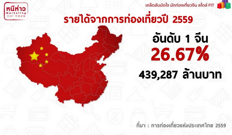 นักท่องเที่ยวต่างชาติที่มาเมืองไทยมากที่สุดในปี 2559 คือ “นักท่องเที่ยวจีน” ด้วยจำนวน 8,221,526 คน ทำรายได้ให้ภาคการท่องเที่ยวไทยเป็นอันดับ 1 อยู่ที่ 439,287 ล้านบาท