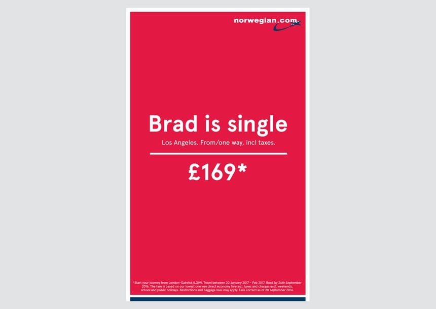 แบรด พิตต์ โสดแล้ว รีบจองตั๋วเครื่องบินมาจีบแบรดให้ไว อย่าปล่อยให้โอกาสหลุดมือ! หลายๆคนอาจจะงงว่า แค่พิมพ์คำว่า แบรด โสดแล้ว จะเป็น Print ad ระดับรางวัลได้อย่างไร แต่งานชิ้นนี้พิสูจน์ให้เราเห็นได้อย่างชัดเจนว่า โฆษณาสื่อสิ่งพิมพ์ยังไม่ตาย แต่แค่เปลี่ยนบริบท ไปอยู่บนออนไลน์ และ Content เท่านั้นเอง เพราะหลังจากที่ สายการบิน Norwegian ตีพิมพ์งานชิ้นนี้บนหนังสือพิมพ์ ก็ทำให้ยอดขายเพิ่มขึ้น 32% ได้รับการพูดถึงจากสื่อต่างๆ เป็นมูลค่ามีเดียรวมทั้งสิ้น 300 ล้าน ดอลลาร์ มีคนเข้าถึงโฆษณาชิ้นนี้ หรือ reach ในออนไลน์ถึง 53 ล้านคน และ ถูกตีพิมพ์เป็นบทความ หรือ เป็นหัวข้อข่าวไปทั่วโลก ถึง 890 ชิ้น เห็นตัวเลขแล้ว ก็สามารถพิสูจน์ ได้ใช่ไหมครับ ว่า Print ad ยังไม่ตายจริงๆ
