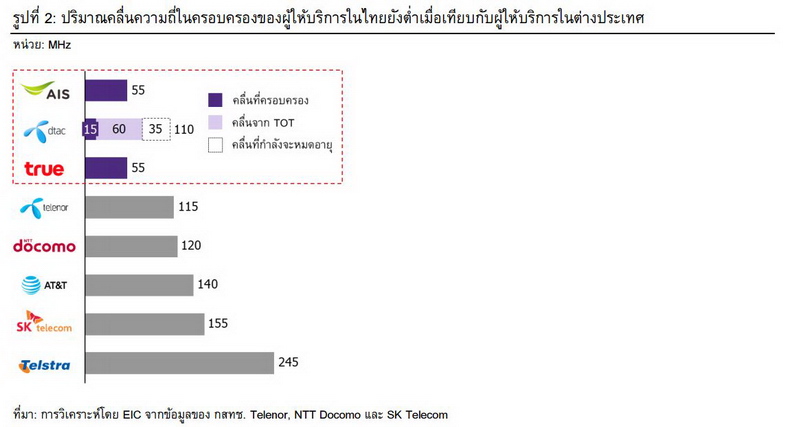 อย่างไรก็ดี อีไอซีมองว่าการแข่งขันของค่ายมือถือจะไม่ทวีความรุนแรงขึ้น เนื่องจากสภาวะการแข่งขันด้านราคาในปัจจุบันนั้นมีความรุนแรงอยู่แล้ว โดยรายได้เฉลี่ยต่อเลขหมาย (Average Revenue Per User: ARPU) ในช่วง 5 ปีที่ผ่านมาเริ่มคงที่ในระดับ 200 บาทซึ่งลดลงจาก 15 ปีก่อนกว่าครึ่ง รวมถึงผู้เล่นรายอื่นมีคลื่นความถี่ในครอบครองที่เพียงพอต่อการให้บริการปัจจุบันราว 55 MHz ทั้งนี้ อีไอซีมองว่าผู้เล่นจะหันมาแข่งขันในการนำเสนอบริการเสริมแทนที่จะมุ่งเน้นการแข่งขันด้านราคาเพื่อเพิ่มรายได้และสร้างความผูกพันธ์ต่อลูกค้า เช่น บริการด้านบันเทิง บริการคลาวด์ และบริการด้านการชำระเงินอิเล็กทรอนิกส์ เป็นต้น