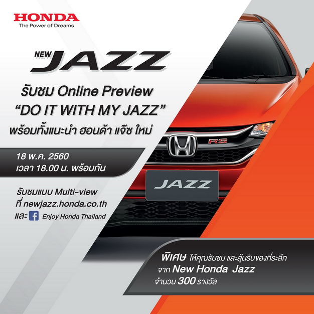 บริษัท ฮอนด้า ออโตโมบิล (ประเทศไทย) จำกัด เชิญชวนทุกท่านร่วมรับชม Online Preview “DO IT WITH MY JAZZ” พร้อมแนะนำ ฮอนด้า แจ๊ซ ใหม่ ในวันที่ 18 พ.ค. นี้ เวลา 18.00 น. ผ่านช่องทางออนไลน์เต็มรูปแบบ