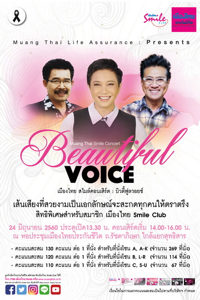 ล่าสุด “เมืองไทย Smile Club” พร้อมมอบความสุขและรอยยิ้มด้วยบทเพลง ในกิจกรรมสุดพิเศษ “เมืองไทย Smile Concert: Beautiful Voice” พบกับ 3 ศิลปินคุณภาพที่มีเส้นเสียงที่เป็นเอกลักษณ์ พร้อมสะกดทุกคนให้ตราตรึง แอม เสาวลักษณ์ ลีละบุตร ปั่น ไพบูลย์เกียรติ เขียวแก้ว และ ชรัส เฟื่องอารมย์ ที่มาร่วมถ่ายทอดความรู้สึกผ่านเสียงเพลงสุดไพเราะกับคอนเสิร์ตแสนสนุก สมกับคอนเซปต์ใหม่ของเมืองไทย Smile Club สไมล์ สนุก สุขรอบตัว โดยงานดังกล่าวจะจัดขึ้นในวันที่ 24 มิถุนายน 2560 เวลา 13.30 น. ณ หอประชุมเมืองไทยประกันชีวิต