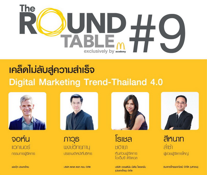 เตรียมเผยเคล็ดการสร้างธุรกิจให้สำเร็จในโลกดิจิตัล ในงาน The Roundtable ครั้งที่ 9 หรือ “เคล็ดไม่ลับสู่ความสำเร็จ Digital Marketing Trend–Thailand 4.0” พร้อมเผยประสบการณ์และข้อเท็จจริงของพฤติกรรม Online Users และปลดล๊อคความสำเร็จการทำตลาดออนไลน์รวมถึงการปรับใช้เทคโนโลยีให้เหมาะสมตามโมเดลไทยแลนด์ 4.0 และเทรนด์ดิจิตัลมาร์เก็ตติ้งของไทยและต่างประเทศ ในวันศุกร์ที่ 21 กรกฎาคม 2560 เวลา 14.00 น. เป็นต้นไปที่ศูนย์การเรียนรู้ M academy
