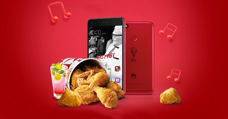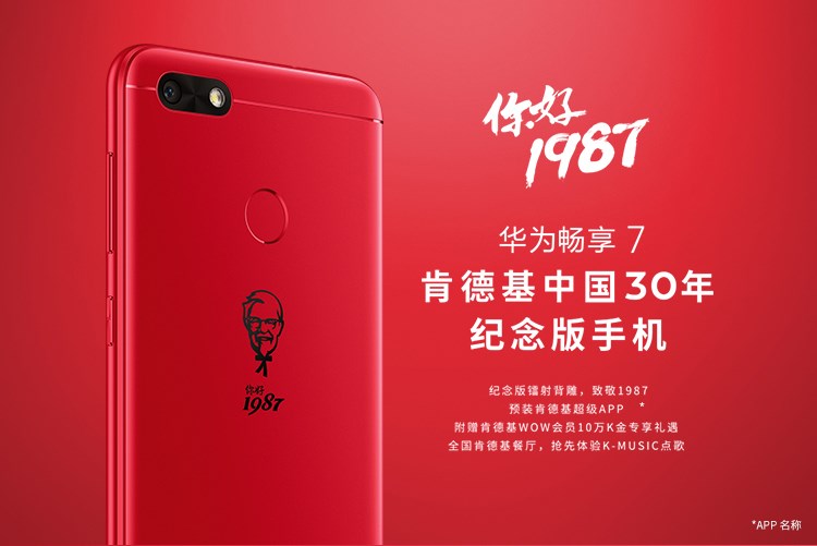 แฟนๆ ตัวยงของ KFC กำลังจะมีโอกาสได้ถือผู้พันแซนเดอร์ไว้ในมือ หลัง KFC ร่วมกับ Huawei ฉลองครบรอบ 30 ปีในจีนและในโอกาสครบรอบ 5,300 สาขา ออกโทรศัพท์มือถือรุ่น Limited Edition Huawei 7 Plus เมื่อวันที่ 7 เดือน 7 ที่ผ่านมา Steven Li, Senior Vice president ของ KFC ในบริษัท Yum China กล่าวว่าทั้งสองบริษัทมีตำนานร่วมกัน คือในปี 1987 KFC เปิดสาขาแรกในจีนในขณะที่ Huawei ก็เริ่มกิจการแรกที่ Shenzhen Industrial Park เช่นกันด้วยพนักงานเพียง 14 คน