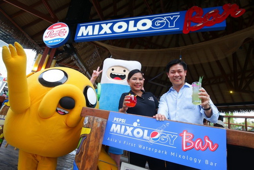 นายสมชัย เกตุชัยโกศล (ขวา) ผู้อำนวยการฝ่ายการตลาด กลุ่มธุรกิจเครื่องดื่ม บริษัท เป๊ปซี่-โคล่า (ไทย) เทรดดิ้ง จำกัด พร้อมด้วย นางสาวกิ่งแก้ว พึ่งเจษฎา (ซ้าย) รองประธานเจ้าหน้าที่ฝ่ายปฏิบัติการ บริษัท อเมโซน ฟอลล์ จำกัด ผนึกกำลังเสิร์ฟความซ่า…ผสมไอเดียความสนุก ร่วมเปิดตัว “เป๊ปซี่ มิกซ์โซโลจี้ บาร์” (Pepsi® Mixology Bar) บาร์เครื่องดื่มสุดฮิปสไตล์ทรอปิคอลในสวนน้ำระดับโลกแห่งแรกในเอเชีย! อย่างเป็นทางการ พร้อมนำเสนอเมนูเครื่องดื่มม็อคเทลสูตรพิเศษที่สร้างสรรค์จากผลิตภัณฑ์เครื่องดื่มในเครือเป๊ปซี่และได้รับแรงบันดาลใจจากเครื่องเล่นสุดฮิตภายในสวนน้ำและคาแรคเตอร์ของเหล่าการ์ตูนเน็ทเวิร์คฯ อาทิ จอห์นนี่ บราโว่, ฟินน์แอนด์เจค, เบ็นเท็น และ พาวเวอร์พัฟฟ์ เกิร์ลส์ ณ สวนน้ำการ์ตูนเน็ทเวิร์ค อเมโซน เมื่อเร็ว ๆ นี้