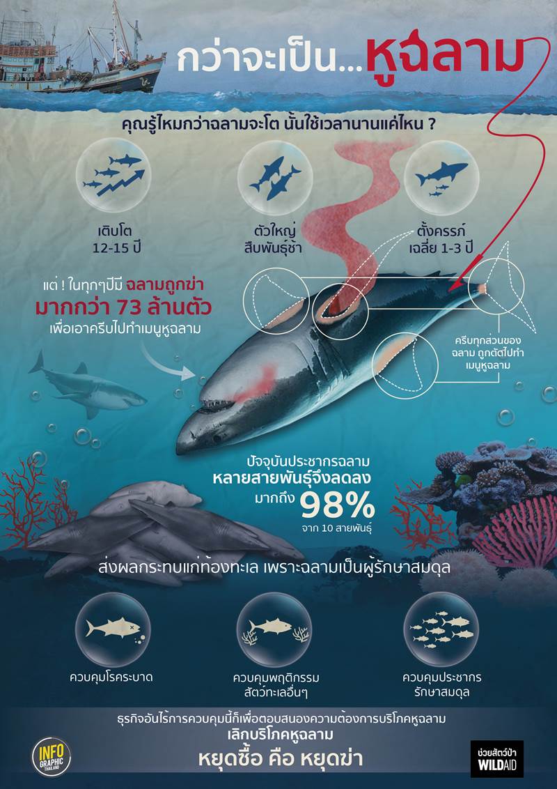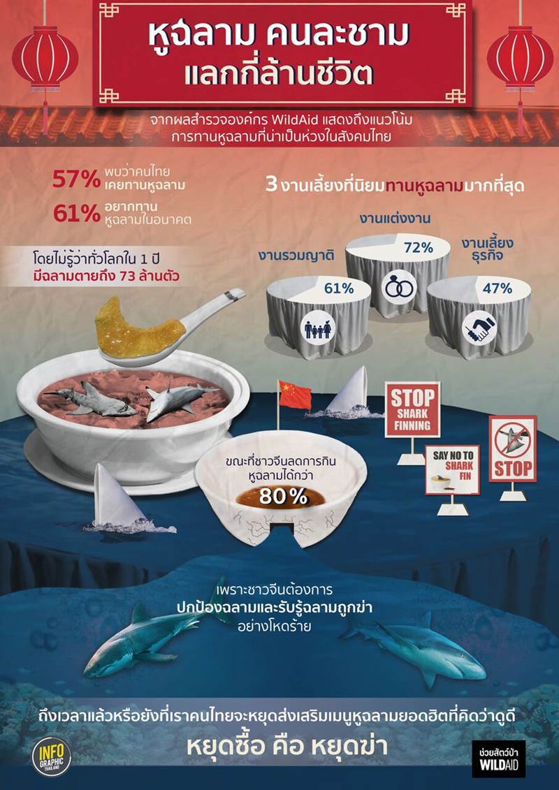 “ความต้องการบริโภคหูฉลามส่งผลกระทบโดยตรงต่อการลดลงของจำนวนฉลามทั่วโลก โดยช่วง 15 ปีที่ผ่านมา ปลาฉลามลดลงจากเดิมถึง 98% มีปลาฉลามเฉลี่ย 100 ล้านตัวต่อปีที่ถูกฆ่า หรือกว่า 2 แสนตัวต่อวัน โดยมีครีบของฉลามถึง 73 ล้านตัว ที่ถูกนำมาทำเป็น “ซุปหูฉลาม” ซึ่งเป็นปริมาณที่มากกว่าจำนวนคนไทยทั้งประเทศรวมกันเสียอีก โดยที่คนไทยจะกินหูฉลามในหลากหลายโอกาส 72% จะกินในงานแต่งงาน 61% กินกับคนในครอบครัวที่ร้านอาหาร และ 47% กินในงานลี้ยงทางธุรกิจต่างๆ”