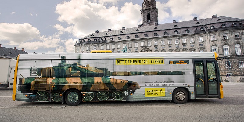 Copenhagen เป็นเมืองหนึ่งที่มีไอเดียดีๆ ในการจัดการให้รถบัสในเมืองเป็นสื่อโฆษณาเจ๋งๆ มาหลายงาน ก่อนหน้านี้ก็เคยทำโฆษณาจิกกัดประธานาธิบดีสหรัฐคนล่าสุดมาแล้ว ตอนนี้มีงานใหม่ที่น่าสใจและเป็นประโยชน์ในการต่อต้านสงครามและปลุกจิตสำนึกส่วนรวมในการให้ที่พักพิงแก่ผู้ลี้ภัย โดยเป็นแคมเปญของ Amnesty International