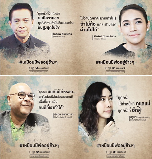 เหล่าดาราที่ได้ร่วมชมคลิปหนังสั้นเรื่อง “เหมือนมีพ่ออยู่ข้างๆ” นี้ ต่างมีความรู้สึกภาคภูมิใจต่อพ่อ ที่เป็นแบบอย่างของปวงชนชาวไทย ได้แก่ เปอร์ สุวิกรม อัมระนันทน์ (นักแสดง/พิธีกร) กล่าวว่า พ่อที่รักคนไทยทั้งประเทศ พ่อทำในสิ่งที่ชอบ ทำในสิ่งที่รัก ทำเพื่อคนอื่นมาตลอด ครูเงาะ รสสุคนธ์ กองเกตุ (โค้ช/ครูสอนการแสดง) กล่าวว่า ทุกครั้งที่เหนื่อย จะมีคนๆหนึ่งที่เหนื่อยกว่าเราเยอะเลย คือ ในหลวงรัชกาลที่ 9 อุ๋ย นนทรีย์ นิมิบุตร (ผู้กำกับภาพยนตร์) กล่าวว่า สิ่งที่พ่อทำทั้งหมดเพื่อพวกเรา เป็นแรงบันดาลใจให้ผมเสมอมา สุหฤท สยามวาลา (ศิลปิน นักร้อง นักดนตรี) กล่าวว่า เราเป็นส่วนหนึ่งเล็กๆในการทำดี ที่จะร่วมสร้างการเปลี่ยนแปลงให้สังคมได้ ไตรภพ ลิมปพัทธ์ (พิธีกร นักแสดง) กล่าวว่า ทุกครั้งที่นึกถึงพ่อ ผมมีความสุข เป็นแบบอย่างสูงสุดในใจ ณิชชาพัณณ์ ชุณหะวงศ์วสุ (นักแสดง-พิธีกร) กล่าวว่า ถ้ามัวเปรียบเทียบตัวเองกับคนอื่น โดยไม่พอเพียงเราจะไม่มีความสุขเลย ศิรพันธ์ วัฒนะจินดา (นักแสดง-พิธีกร) กล่าวว่า ไม่ว่าปัญหาจะมากมายเท่าไหร่ ถ้าไม่ท้อเราจะสามารถผ่านไปได้ เป็นต้น นอกจากนี้ สนพ. ยังอยากเชิญชวนให้คนไทยทุกคนใช้ทรัพยากรพลังงานอย่างรู้คุณค่าตลอดไป “ชีวิตพอเพียง ชีวิตหาร 2” สามารถรับชมคลิปได้ที่ https://youtu.be/JAYBITZmmuI หรือ Facebook รวมพลังหาร 2