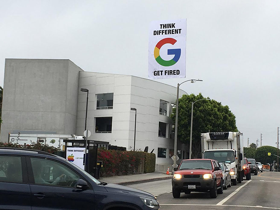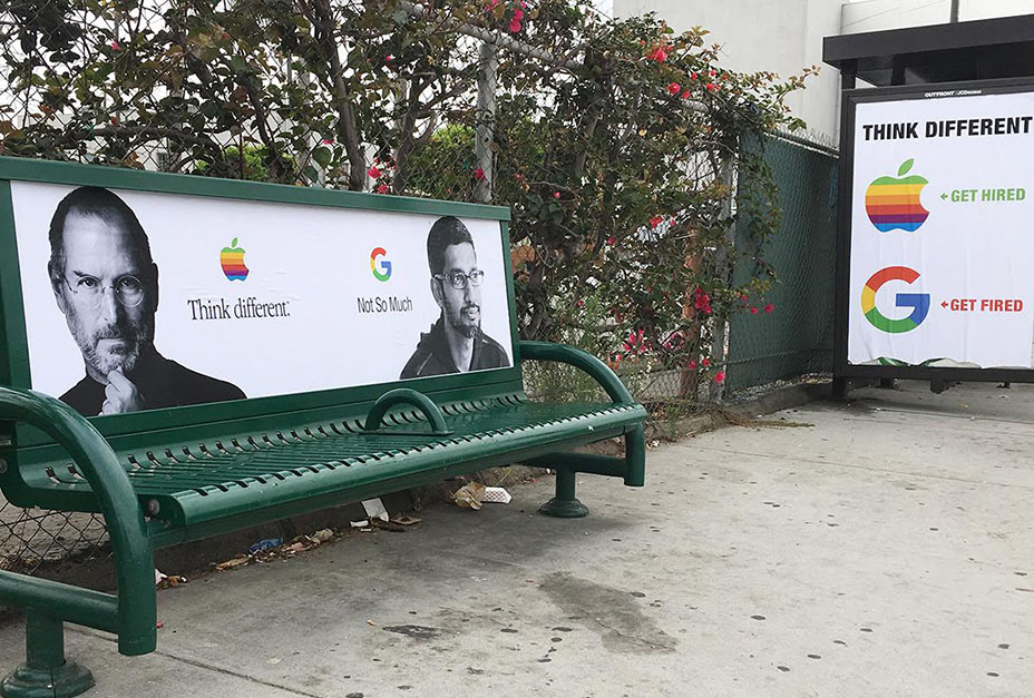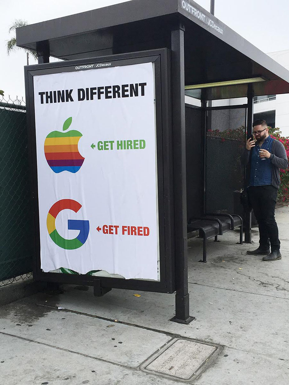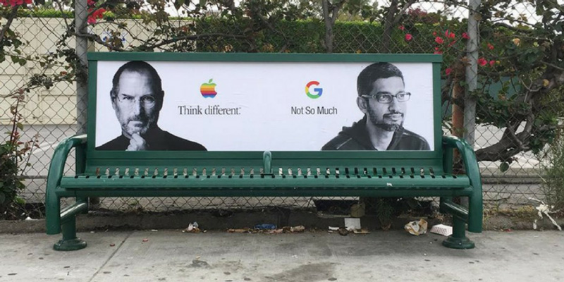 โฆษณาเอาท์ดอร์สุดกวนที่ดูเหมือนจะสร้างเสียงหัวเราะให้กับผู้ชมแต่กลายเป็นเรื่องสุดดราม่า เมื่อศิลปินที่เรียกตัวเองว่า Sabo ได้เริ่มไอเดียด้วยการทำป้ายที่ดูคล้ายโฆษณาอย่างเป็นทางการของ Google โดยใช้ Motto ที่ทรงอิทธิพลวลีหนึ่งในวงการไอทีและดีไซน์ที่ว่า ‘Think Different’ ของ Steve Jobs ผู้ก่อตั้งบริษัท Apple แล้วในป้ายเดียวกันก็ต่อท้ายด้วยวลีของ Sundar Pichai ซีอีโอคนปัจจุบันของ Google ที่พูดว่า ‘Not So Much’ คล้ายกับว่ากูเกิ้ลต้องการข่มแอปเปิ้ลด้วยหัวเรือใหญ่ทั้ง 2 ฝ่าย แถมป้ายดังกล่าวยังตั้งอยู่ที่ Venice, California ใกล้ๆ กับออฟฟิศของกูเกิ้ลและยูทูบบางแผนก ก็เลยยิ่งดูเนียนไปอีก แต่ในความจริงแล้ว นี่เป็น Mock up ที่ศิลปินตั้งใจเมคขึ้น เพื่อระบุถึงข้อความประชดประชัน ที่ตั้งอยู่ใกล้กัน โดยหลังโลโก้ของ Apple มีข้อความ Get Hired นัยว่า ถ้าคิดต่างแล้วจะได้รับการว่าจ้าง ขณะที่หลังโลโก้ Google กลายเป็นข้อความ Get Fired คิดต่างแล้วถูกไล่ออก