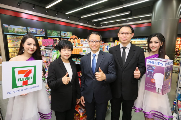คุณเฉลิมพงษ์ ดรงค์สุวรรณ (กลาง) กรรมการผู้จัดการ บริษัท ฟิลิปส์อิเล็กทรอนิกส์ (ประเทศไทย) จำกัด ร่วมกับ คุณยุทธศักดิ์ ภูมิสุรกุล (ขวา) รองกรรมการผู้จัดการอาวุโส สายงานการตลาดและบริหารผลิตภัณฑ์ บริษัท ซีพี ออลล์ จำกัด (มหาชน)และคุณภภัสสร ธนสร (ซ้าย) ผู้ช่วยกรรมการผู้จัดการ สำนักจัดซื้อ บริหารเซเว่น อีเลฟเว่น ร่วมบุกตลาดหลอดไฟแอลอีดีถนอมสายตา