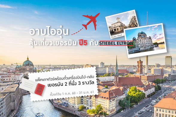 สตีเบล เอลทรอน ผู้ผลิตเครื่องทำน้ำอุ่น น้ำร้อนชั้นนำจากประเทศเยอรมนี กลับมาอีกครั้งกับแคมเปญประจำปี “อาบไออุ่น อาบไออุ่น ลุ้นเที่ยวเยอรมัน ปี 5” เฟ้นผู้โชคดีร่วมลุ้นรางวัลใหญ่สุดเอ็กซ์คลูซีฟ กับทริปพาผู้โชคดีบินลัดฟ้าไปประเทศเยอรมนี สำหรับลูกค้าสตีเบล เอลทรอนโดยเฉพาะ เพียงช้อปสินค้าใดก็ได้จาก สตีเบล เอลทรอน ตั้งแต่ 1,000 บาทขึ้นไปจะได้รับคูปองร่วมลุ้นชิงโชครางวัลตั้งแต่วันนี้จนถึงวันที่ 31 ธันวาคม 2560