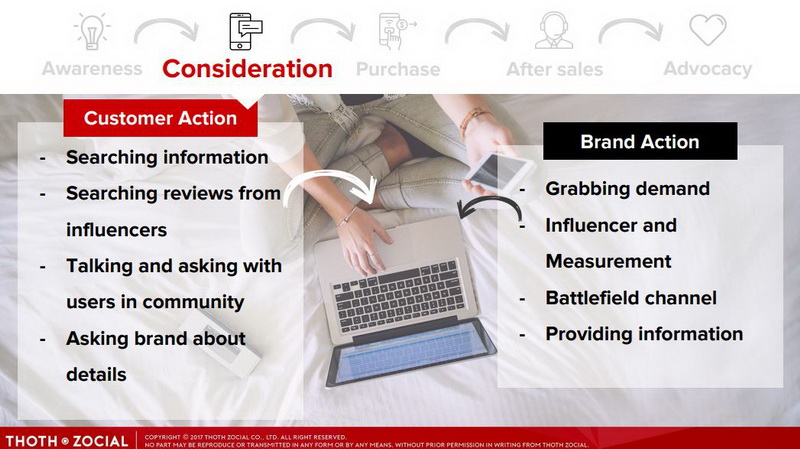 จากนั้นเข้าสู่ขั้นตอน “Considering” ทุกวันนี้ก่อนตัดสินใจซื้อ ผู้บริโภคหาข้อมูลจากแหล่งต่างๆ เสมอ ทั้งรีวิว ตั้งกระทู้ถามในเว็บบอร์ด ที่เป็น Community เกี่ยวกับที่อยู่อาศัย รวมถึงขอข้อมูลเพิ่มเติมจากแบรนด์