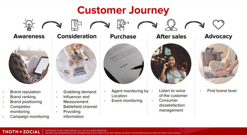 เพราะฉะนั้นในสเต็ป “Awareness” ที่ผู้บริโภคได้รับข้อมูลข่าวสารจากสื่อช่องทางต่างๆ และจากความต้องการของตัวเอง ในขณะที่ฝั่งแบรนด์ ต้องสามารถวัด Brand Reputation ว่าลูกค้ารู้สึกกับแบรนด์เราอย่างไร, Brand Ranking การเป็นแบรนด์ในใจผู้บริโภค ไม่จำเป็นต้องเข้าถึงผู้บริโภคทุกกลุ่ม เพราะการตลาดยุคนี้ ไม่ใช่ Mass Marketing แล้ว แต่เป็น Segment Marketing เพราะฉะนั้นแบรนด์สามารถเป็นอันดับ 1 ในใจผู้บริโภคเฉพาะกลุ่มเป้าหมายก็ได้, Brand Positioning, Competitor Monitoring, Campaign Monitoring
