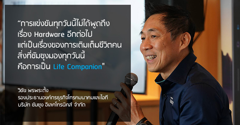 “การแข่งขันทุกวันนี้ไม่ได้พูดถึงเรื่อง Hardware อีกต่อไป มันเป็นเรื่องของการเติมเต็มชีวิตคน เราไม่พูดกันเรื่องสเปคอีกแล้ว Forget It สิ่งที่ซัมซุงมองทุกวันนี้ ก็คือการเป็น Life Companion (คู่หูของชีวิต-ผู้เขียน) เราต้องคิดเยอะขึ้น ถ้าคุณจะออกกกำลังกาย เราต้องทำอย่างไรให้คุณออกกำลังกายได้ง่ายขึ้น หรือถ้าคุณอยากช็อปปิ้ง เราต้องคิดว่าเราจะทำยังไงให้คุณช็อปปิ้งสะดวกขึ้น อย่างตอนนี้เรากำลังพูดกันถึงเรื่อง Mobile Banking หรือทุกวันนี้โทรศัพท์มือถือถูกใช้เป็น E-Money เราก็ต้องตั้งคำถามว่า Security มันดีพอไหม โทรศัพท์มือถือทุกวันนี้กลายเป็นอวัยวะที่อยู่กับเราตลอดวัน ยกเว้นตอนนอน”