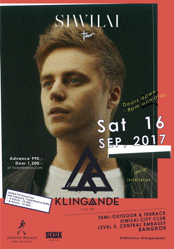 ห้ามพลาดประสบการณ์การแสดงสดของ KLINGANDE ในวันเสาร์ที่ 16 กันยายน 2017 โดยมี DJ YP เป็นผู้มาเล่นเสริมสร้างบรรยากาศ ก่อนการแสดงสด ปลดปล่อยท่าเต้นบนแดนซ์ฟลอร์ที่ Semi-Outdoor และ Terrace กลางแจ้ง ณ ชายหาดลอยฟ้า พร้อม Installation สุดพิเศษจาก SIWILAI Tour อย่าลืมชิมเมนูอาหารและเครื่องดื่มสุดพิเศษที่ได้รับการสร้างสรรค์โดย Johnnie Walker Gold Label Reserve สำหรับค่ำคืนนี้เท่านั้น บัตรราคา 990 บาท บัตรหน้างาน 1,200 บาท เปิดประสบการณ์ดนตรีแบบใหม่ได้ตั้งแต่เวลา 20.00 น. เป็นต้นไป