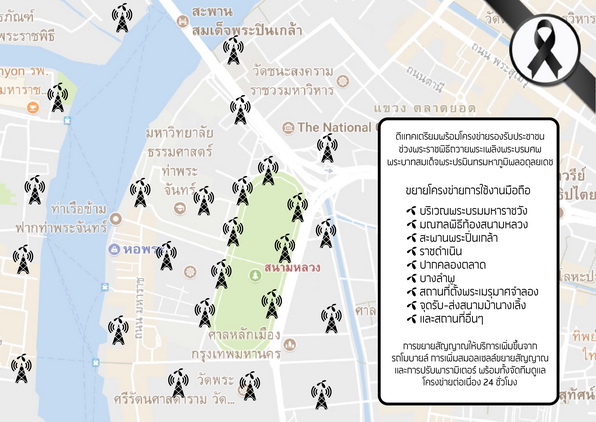 ดีแทคยังขยายโครงข่ายให้พร้อมรองรับการใช้งานทั้งบริเวณจุดอำนวยความสะดวกที่จอดรถ และจุดรับ-ส่งประชาชนสู่มณฑลพิธีท้องสนามหลวง เช่นพื้นที่จุดรับ-ส่งสนามม้านางเลิ้ง เป็นต้น นอกจากนี้ ดีแทคยังจัดเตรียมทีมงานพิเศษเพื่อประจำจุดสำคัญดูแลโครงข่ายบริเวณมณฑลพิธีท้องสนามหลวง และสถานที่ตั้งพระเมรุมาศจำลองอีกด้วย
