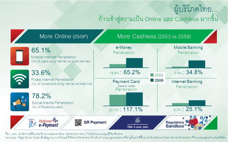 – ปัจจัยด้านพฤติกรรมผู้บริโภคที่เปลี่ยนไป ปัจจุบันคนไทยใช้ชีวิตและทำธุรกรรมการเงินบนโลกออนไลน์มากขึ้น โดยพฤติกรรมการใช้ “Mobile Banking” เพิ่มขึ้นอย่างเห็นได้ชัด จากสัดส่วนจำนวนบัญชี Mobile Banking ต่อประชากรที่ 0.9% ในปี 2553 ขยับขึ้นเป็น 34.8% ในปี 2559 เช่นเดียวกับผู้ใช้ e-Money, Internet Banking และบัตรอิเล็กทรอนิกส์ที่เพิ่มขึ้นเช่นกัน