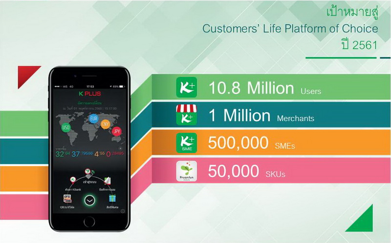 – K PLUS SHOP แอปพลิเคชันสำหรับร้านค้า เพื่อรับชำระด้วย QR Code คาดว่าในปี 2560 จะมีร้านค้าใช้งาน 200,000 ร้าน และในปี 2561 จะเพิ่มเป็น 1,000,000 ร้าน