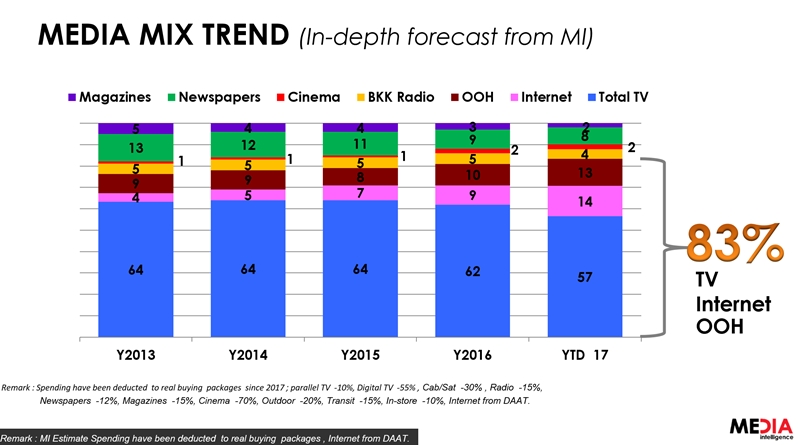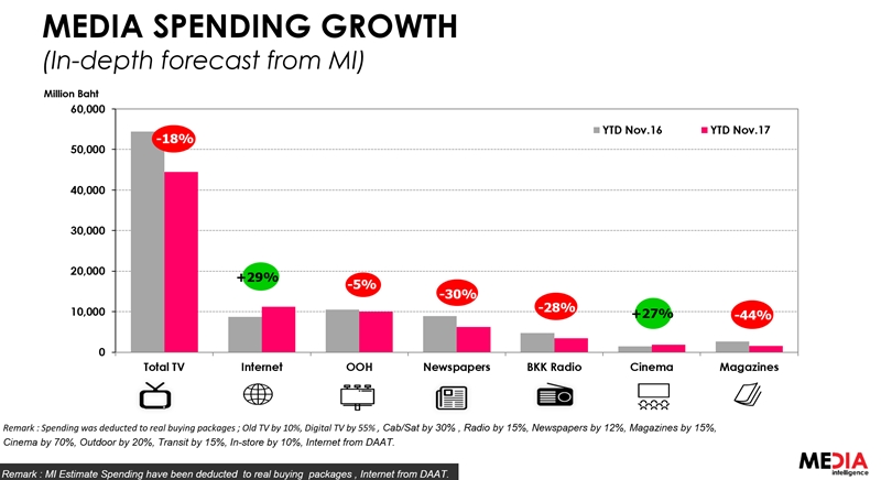 “การใช้เงินโฆษณาของแบรนด์จะมองที่วัตถุประสงค์และกลุ่มเป้าหมายเป็นหลัก บางแบรนด์ที่โฟกัสกลุ่มเป้าหมายชัดเจนก็เลือกที่จะใช้สื่อออนไลน์เพียงอย่างเดียวโดยที่ไม่ใช้ทีวีเลยก็เริ่มมีให้เห็นมากขึ้น หรือหากบางแบรนด์ต้องการลงพื้นที่เฉพาะก็อาจจะเลือกใช้งบสำหรับ Local Media ซึ่งจะเปลี่ยนไปตามโจทย์ของแต่ละสินค้า ขณะที่ราคาโฆษณาของแมกกาซีนมีแนวโน้มถูกลง โดยไม่ได้มาจากการปรับลดราคา แต่เป็นการเพิ่มโปรโมชั่นเพื่อให้ได้แพกเกจที่คุ้มค่ามากยิ่งขึ้น ซึ่งก็ไม่ช่วยกระตุ้นได้มากนัก เพราะปัญหาไม่ได้มาจากราคาโฆษณาของแมกกาซีนแพงเกินไป แต่มาจากการที่คนเริ่มไม่ค่อยอ่านหนังสือแล้ว เมื่อหารเฉลี่ย Eyeball ออกมาแล้วจึงรู้สึกไม่คุ้มค่า ทำให้จำนวนการซื้อโฆษณาในนิตยสารลดน้อยลงอย่างต่อเนื่อง”