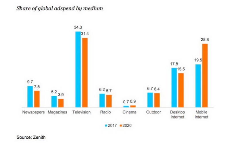 สะท้อนได้จากสถิติเทรนด์โฆษณาทั่วโลก ปี 2017 เป็นปีแรกที่สื่อโฆษณาอินเทอร์เน็ต (205 ล้านเหรียญสหรัฐ) สูงกว่าสื่อทีวี (192 ล้านเหรียญสหรัฐ)