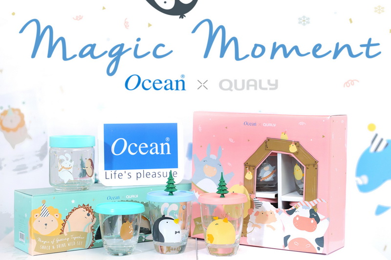 ในช่วงเดือนพฤศจิกายนนี้ บริษัทฯ โอเชียนกลาส จำกัด (มหาชน) ได้สร้างสรรค์ของขวัญสุดพิเศษ ซึ่งครั้งนี้ทางบริษัทฯ ได้ร่วมกับแบรนด์ควอลี่ (QUALY) แบรนด์ไทยที่ได้รับรางวัลด้านการออกแบบอย่างมากมาย โดยร่วมออกแบบแก้วพิมพ์ลายสวยมีดีไซน์ ในกล่องของขวัญดีไซน์ใหม่ล่าสุด ชุด Ocean Glass Festive Collection -Limited Edition รุ่น Magic Moment ซึ่งจะมีเหล่าการ์ตูนสัตว์น้อยน่ารักทั้ง 3 ธีม คือ Farm House Theme สีชมพู, Wild Life Theme สีเขียว, Arctic Life Theme สีฟ้า โดยตัวการ์ตูนลูกสัตว์ตัวเล็กสื่อถึงการเริ่มต้นสิ่งใหม่ๆ และตัวการ์ตูนครอบครัวสัตว์สื่อถึงความสัมพันธ์ของคุณกับครอบครัวและเพื่อนๆ กลิสเตอร์สื่อถึงบรรยากาศเฉลิมฉลองในช่วงเทศกาลปีใหม่ พร้อมข้อความสร้างแรงบันดาลใจ และส่งมอบความปราถนาดีให้กับคนพิเศษและครอบครัว เน้นเจาะกลุ่มเป้าหมายเป็นลูกค้าระดับกลางจนถึงระดับบน3 กลุ่มหลัก กลุ่มที่ใช้แก้วของโอเชียนกลาส กลุ่มคนทำงานอายุ 25-35 ปี และกลุ่มวัยผู้ใหญ่อายุ 30-55 ปี เพื่อร่วมส่งมอบความสุขและความปรารถนาดีให้ใน