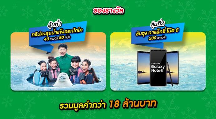 รางวัลใหญ่ทริปตะลุยน้ำแข็งฮอกไกโด สัมผัสกับประสบการณ์สนุกสุดเซอร์ไพรส์แบบใกล้ชิดกับ “เป๊ก ผลิตโชค” และเพื่อนซี๊ “โอ๊ต ปราโมทย์” 40 รางวัล (รางวัลละ 2 ที่นั่ง) และยังมีรางวัลโทรศัพท์มือถือ Samsung Galaxy Note8 ให้ลุ้นอีกจำนวน 200 รางวัล  ส่งได้ไม่จำกัดจำนวน ยิ่งส่งมาก ยิ่งมีโอกาสลุ้นมาก สามารถติดตามรายละเอียดและความเคลื่อนไหวได้ที่เฟซบุ๊ก Oishi Drink Station หรือ www.oishidrink.com #โออิชิฟินหนาวหนึบ