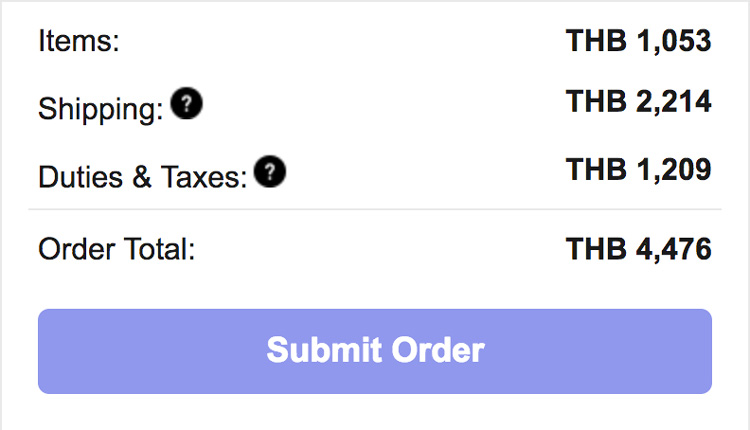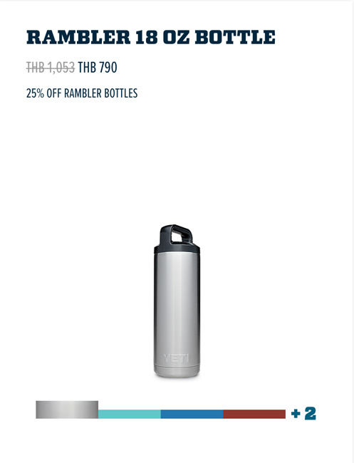 ล่าสุด YETI จึงต้องประกาศย้ำว่าพร้อมส่งมาประเทศไทยด้วยตัวเอง เมื่อเราเข้าเว็บไซต์อย่างเป็นทางการของ YETI จากประเทศไทย จะพบแบนเนอร์ประกาศอย่างชัดเจน เพื่อทำให้ลูกค้าได้สัมผัสประสบการณ์การใช้แก้ว/ ขวด ของแท้ ทางเราได้ทดลองกดสั่งซื้อ RAMBLER 26 OZ BOTTLE ซึ่งตอนนี้ลดราคา 25% เพราะอยู่ในช่วงเทศกาล ราคาอยู่ที่ 1,053 จากราคาเต็ม 1,404 บาท แต่เมื่อรวมกับค่าส่งและค่าภาษีเข้าไปแล้ว รวมราคาที่ต้องจ่ายทั้งหมด 4,476 บาท อยู่ดี ถึงจะมีความพยายามในการลดราคา รวมทั้งแสดงราคาค่าจัดส่งกับภาษีอย่างชัดเจน แต่เห็นราคาแบบนี้แล้ว…คงได้แต่คิดในใจเบาๆ ว่า ฝากเพื่อนหิ้ววนไปค่ะ … วั๊ยยย นี่เราไม่ได้ชี้ช่องอะไรนะ