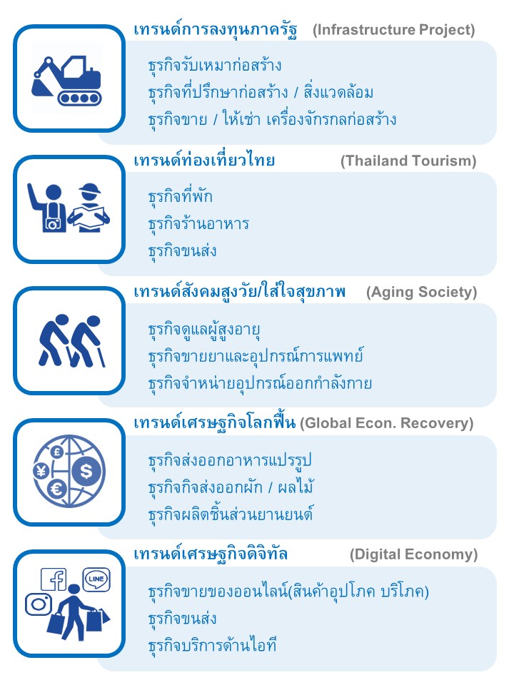 จาก 5 เทรนด์ดังกล่าว เป็นปัจจัยบวกที่จะผลักดันให้ 15 ธุรกิจดังต่อไปนี้ เป็นธุรกิจดาวเด่นที่ได้รับประโยชน์จากเทรนด์เหล่านี้ ได้แก่